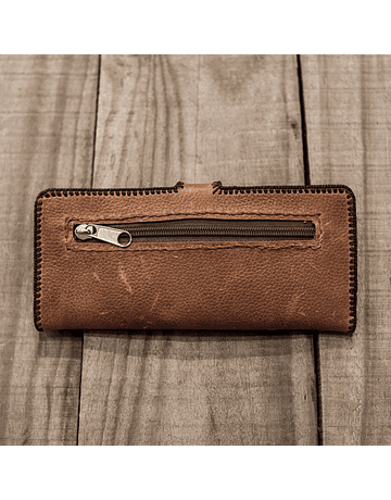 Billetera de cuero Lebu teñido, interior cuero bayo de caballo. Alto 9 cm. y ancho 19 cm., costura de tapada de dos por una con hilo encerado. Cueros provenientes desde la Región de Coquimbo hasta la Región del Biobío, Chile. Hecho completamente a mano.