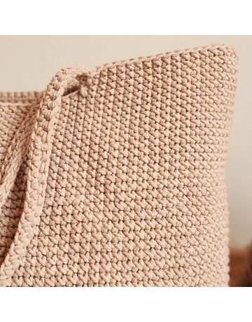 Bolso tejido en hilo de algodón de cinco hebras, realizado en aguja a crochet en punto bajo. Alto 47 cm., ancho 44 cm. Hecho completamente a mano.