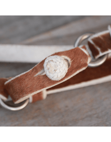 Cabezada en cuero curtido de vaca, con argollas de acero inoxidable y barriles de tiento. Color café. Curtiembre chilena.