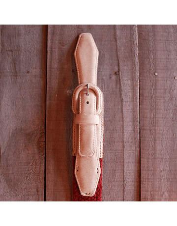 Cinturón de cuero crudo. Largo 1,3 mts. y ancho 4,5 cms. Aplicación de tejido en hilo de algodón trenzado a mano y pespunte de tiento.
