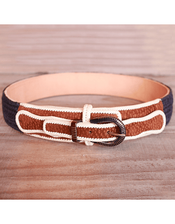 Cinturón en cuero crudo. Largo 1.10 mt. y ancho 4.5 cm. Forrado con badana de vacuno, detalle tejido bordado y hebilla chapeada en bronce. Hecho completamente a mano.