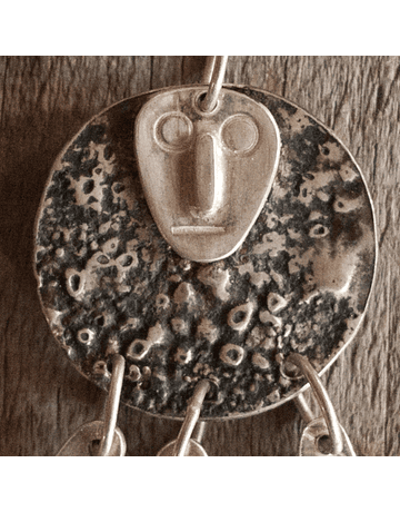 Colgante largo 5,5 cm., ancho 3 cm. Pieza en plata 950. Diseño Collón (ser protector mapuche) con pines de copihues. Hecho completamente a mano.