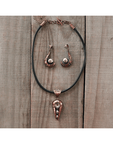 Collar pieza en cobre. Largo 58 cm. Hojas cobre centro largo 14 cm. Cordón en cuero largo 62 cm. Círculos de Alpaca. Piezas caladas, forjadas y patinadas. Técnica Fold Forming. Hecho completamente a mano.
