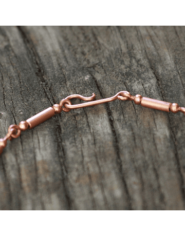 Collar y colgante. Collar Cadena: Largo 40 cm. Colgante: Alto 6 cm., ancho 4 cm., eslabones de cadena en tubos de cobre de 4 mm. amarrados con alambre de cobre de 1,5 mm. Piedra amatista, ajustable. Técnica de cobre martillado. Pieza hecha completamente a mano.
