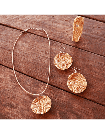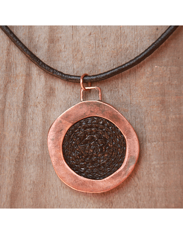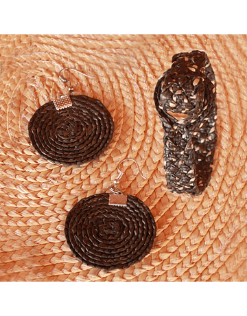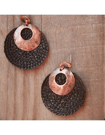 Collar: largo 24 cm. Aros: largo 7 cm. en cobre envejecido y calados, aplicación de paja de trigo tejida de Cutemu, fibra natural de la Región de O´Higgins. Hecho completamente a mano.