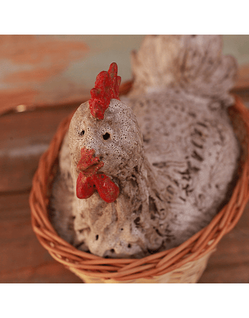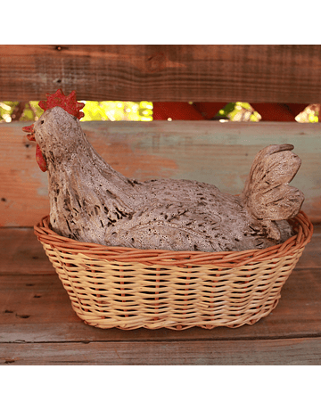 White glazed ceramic hen, 23 cm high and 20 cm wide, in a wicker basket, made of red clay and glazed enamels, a unique piece with the plate and pinch technique.