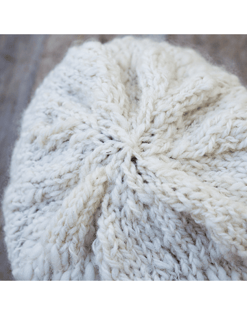 White Merino wool hat with brown stripe dyed with hawthorn seed, stick knitted and hand-spun with wool from the community of Pumanque. Height 20 cm., diameter 50 cm., standard size.