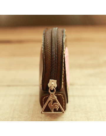 Leather purse. Height 10 cm. and width 8 cm. Application of fabric to loom made under the prestigious quality standard of Doñihue looms.