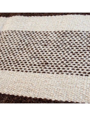 Runner designed with horizontal lines in natural color, woven on a pedal loom with upholstery technique. Combined piece in Merino and Correidale wool from the O'Higgins Region. Dimensions 2.44 meters. long (with fringes) and 0.68 meters. Wide.