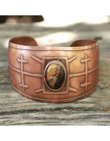Wrist. Width 4 cm. and diameter 6 cm. Petroglyph reproduction drawings with tiger's eye stone. Hammered copper technique. Completely handmade piece.