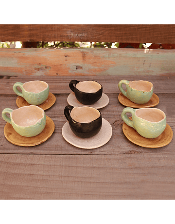 Set of 6 enameled ceramic coffee cups, 6 cm cups. high and 9 cm. wide, saucers 2 cm. high and 14 wide, made of red clay and glazed enamels, unique piece with plate and pinch technique.