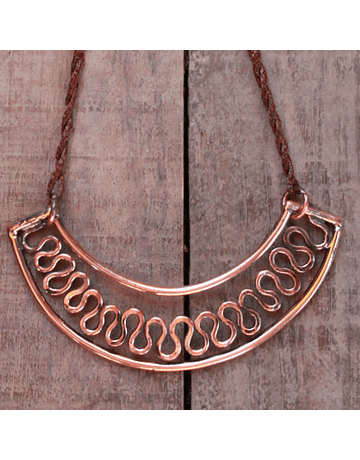 Collana con ciondolo in rame Tiara. Altezza 6 cm. e lunghezza 13 cm. e cordoncino di seta marrone lungo 100 cm. Completamente fatto a mano.