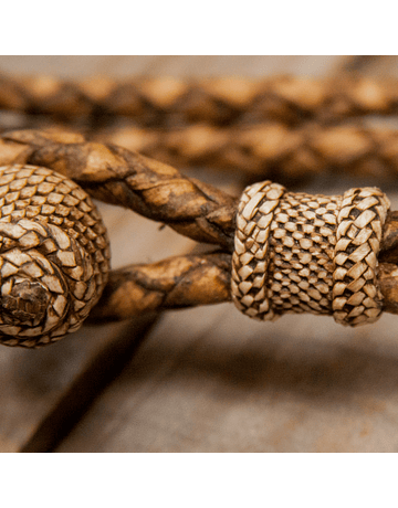 Dos trenzas de 4, ojaleras de ambos extremos enfrentadas en un eje de 16 argolla prisionera pescuezos de 8 botones revestidos con técnica de medio bozal. Misma técnica tejido medio bozal aplicado en las ojaleras. Se recomieda cada cierto tiempo hidratar con pasta de jabón neutro. |