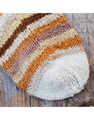 Pack de 2 calcetas largas de lana Merino, franja inicial y punta en color natural, cuerpo a rayas y talón teñidos con quintral, espino, nuez y granada. Tejido a palillo, hilado a mano con lana de la comuna de Pumanque.