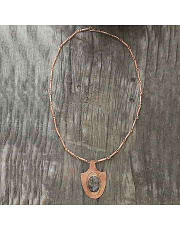 Pulsera diámetro 18 cm., ancho 1,4 cm. Cobre, cadena del Inca con aplicación de piedras amatistas. Hecha completamente a mano.