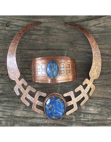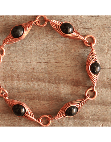 Pulsera diámetro 18 cm., ancho 1 cm. Cobre, tejida con piedra obsidiana.Hecha completamente a mano.